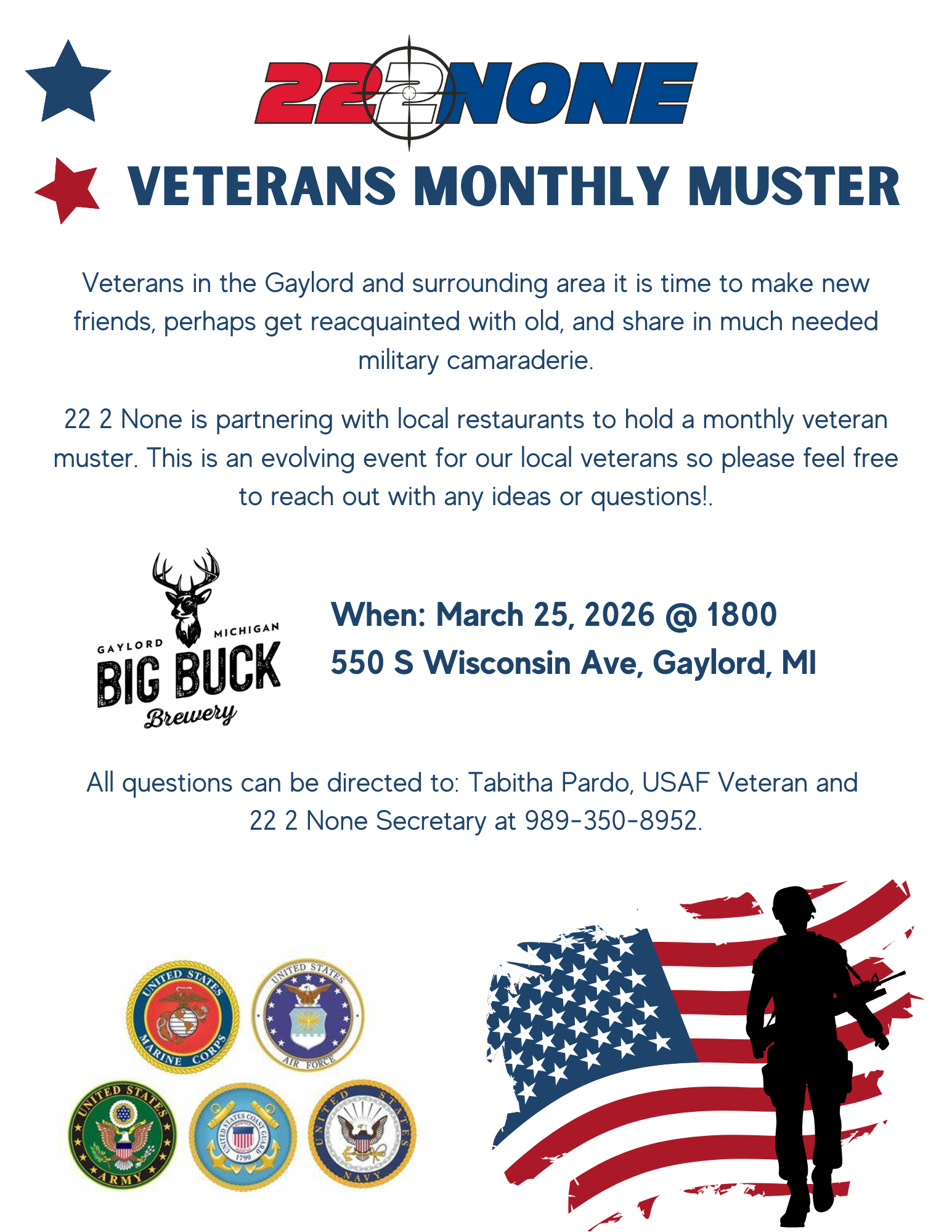 All questions can be directed to Tabitha Pardo, USAF Veteran and 22 2 None Secretary at 989-350-8952.